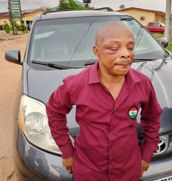 His face is swollen and his right eye is puffed up and he looks polarly different from the warrior that a labour leader is perceived to be. He is a sorry sight, evidence that his kind of business is a very dangerous business in a largely uncivilised country like Nigeria.
