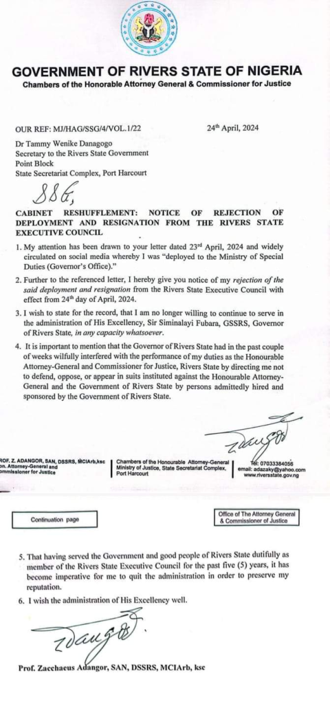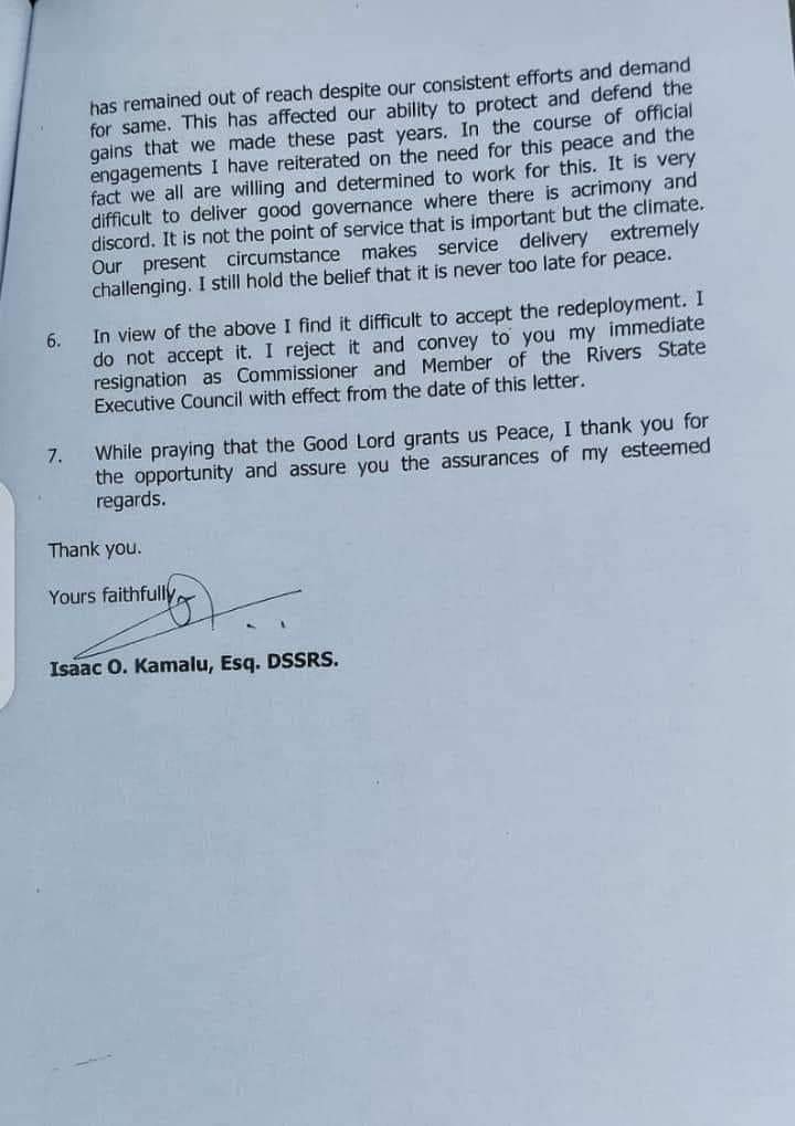 Like Adangor, Kamalu, in a letter to the Secretary to the Rivers State Government, Tammy Danagogo, on Wednesday, rejected his redeployment from the Finance Ministry to the Ministry of Employment Generation and Economic Empowerment.