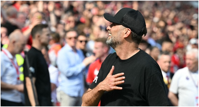 Liverpool’s German manager Jurgen Klopp reacts as he arrives ahead of kick-off in the English Premier League football match between Liverpool and Wolverhampton Wanderers at Anfield in Liverpool, north west England on May 19, 2024.